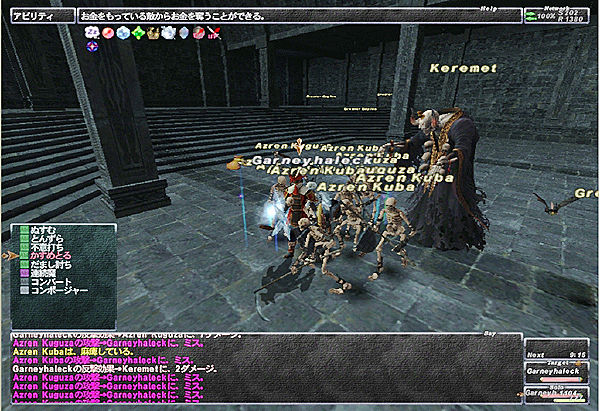 幸い、カギは一匹目でドロップしたので、箱を探して順番に部屋を回り、プロミに必要なカギを落とすコースのNMのいる部屋に入った。なんとなくからまないだろうと思い込んでいたが、コースは魔法を唱え、ついでに廊下にいた骨がわらわらと寄ってきた。連続魔デジョンで逃げようとしたがサポシだった。アイテムもない。骨が意外と弱いのか、HPは減るもののなかなか戦闘不能までいかない。無駄にケアルしたりストンスキンを張り直したりしつつコースと大量の骨にしばらく殴られ続けた。