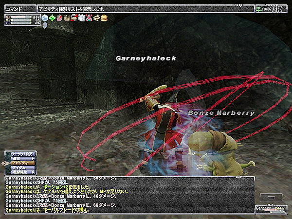 エリチェンを繰り返してNMを釣る事に成功し、序盤は「聖者の招待」でやった連続魔サンダー3で削り、その後接近戦に持ち込みかなり削ったがあと少しで負けてしまった。NMを引きとめようとリレイズで起き上がってすぐ攻撃したらバイオの着弾ダメージでまた死亡。